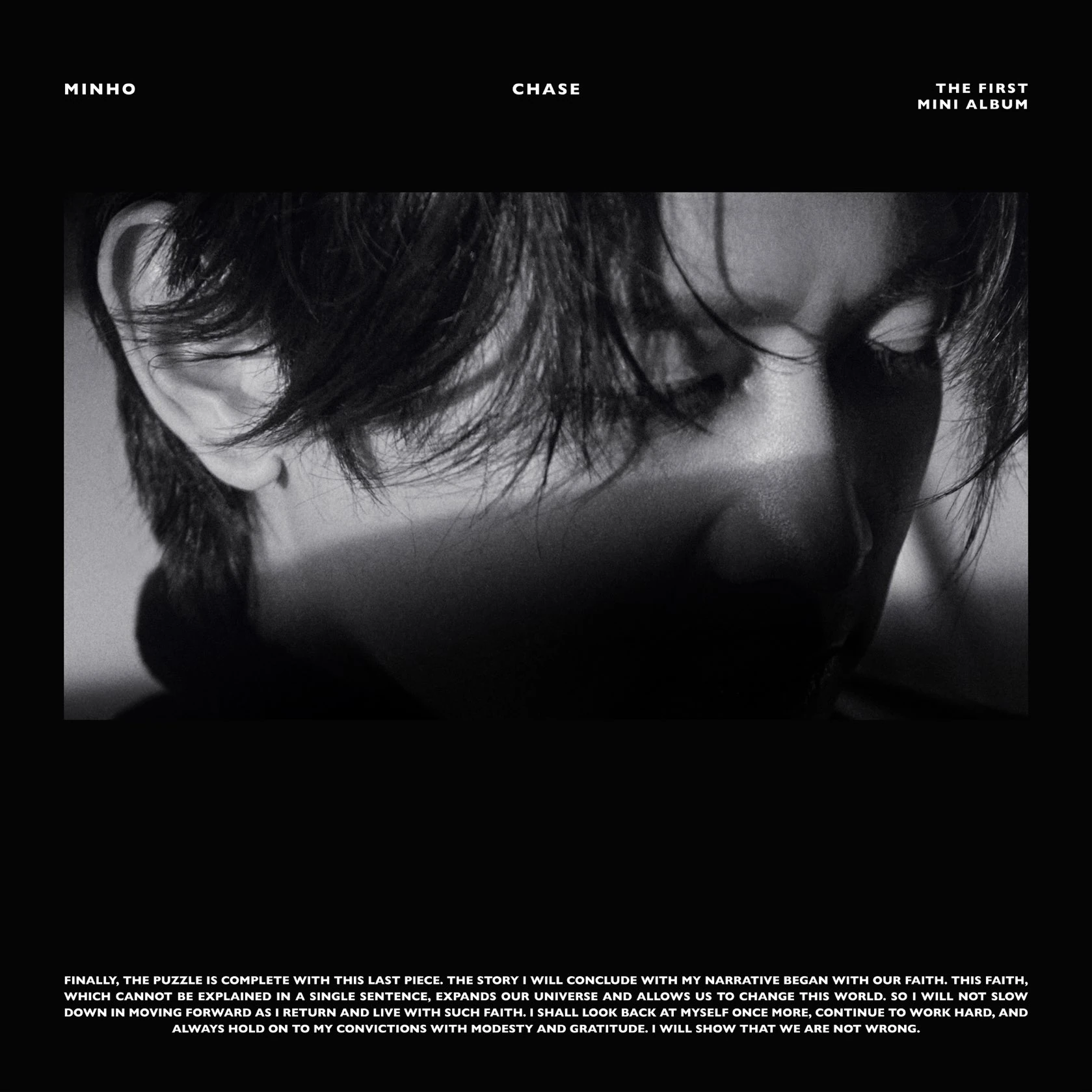 "Finally, the puzzle is complete with this last piece. The story I will conclude with my narrative began with our faith. This faith, which cannot be explained in a single sentence, expands our universe and allows us to change this world. So I will not slow down in moving forward as I return and live with such faith. I shall look back at myself once more, continue to work hard, and always hold on to my convictions with modesty and gratitude. I will show that we are not wrong." —Minho